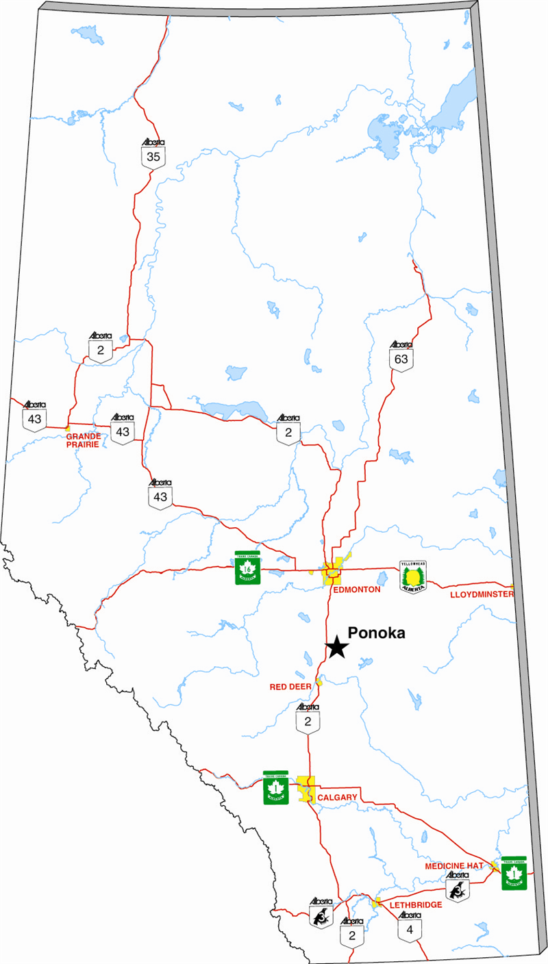 Nestled in the picturesque Battle River Valley, Ponoka is ideally located along the thriving Calgary-Edmonton economic corridor. The heart of downtown Ponoka is located only 3 minutes from the Queen Elizabeth Highway 2. Ponoka is situated at the junction of Highways 2A and 53 providing a more scenic, historical and slower paced route for tourism and local community services.
